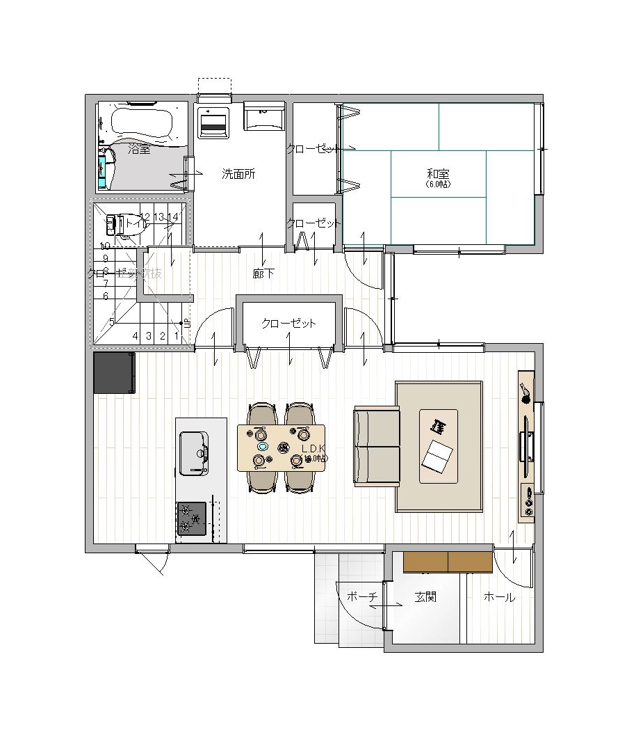 1階中央の廊下部分→リビング収納を2帖に広げてファミクロサイズに!