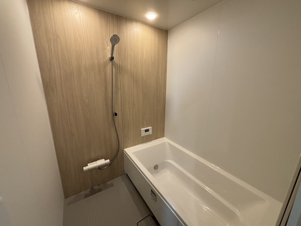 木目のアクセントパネルが落ち着く浴室 窓なしで防犯面もGOOD!