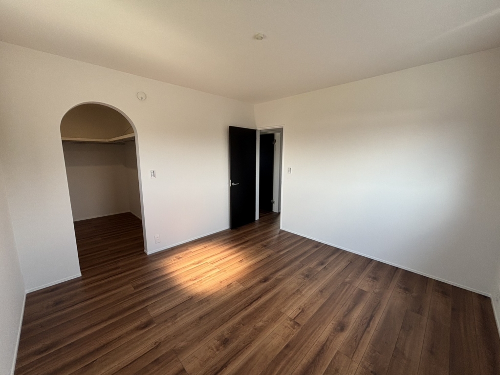 アーチ枠のウォークインクローゼット付きの寝室