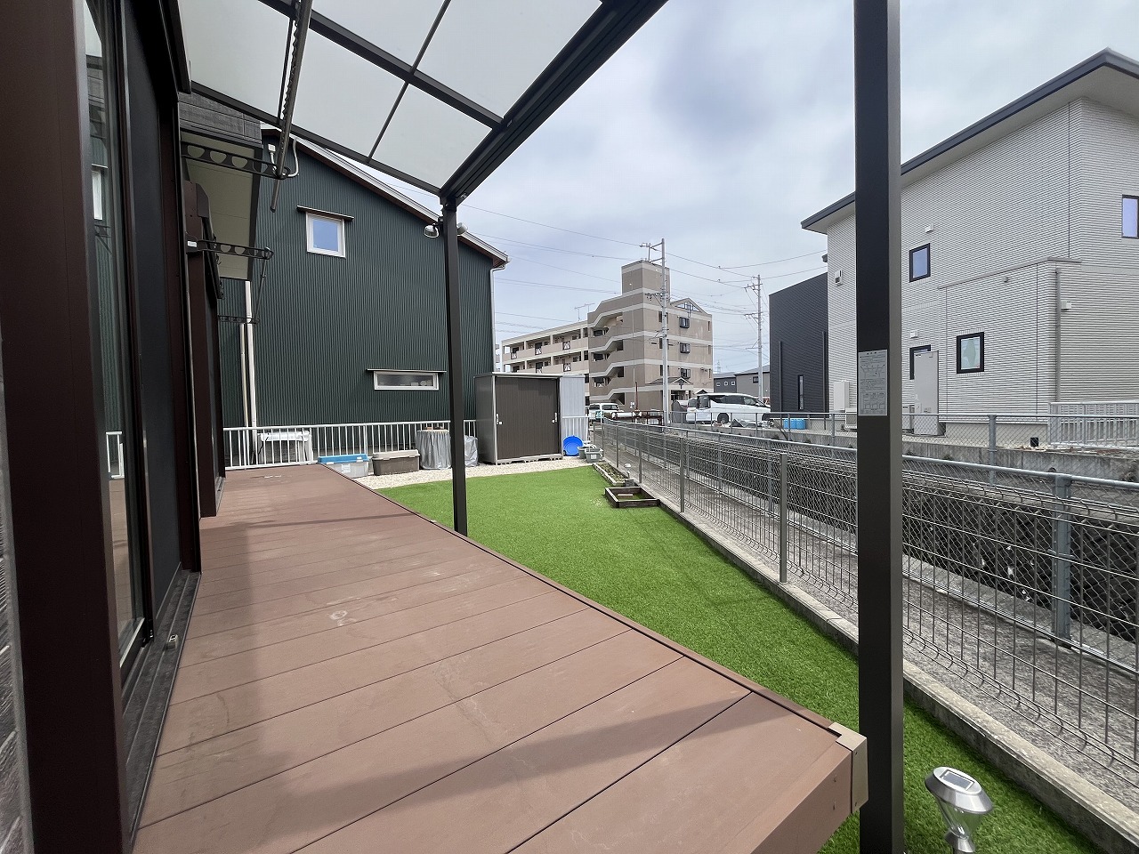 充実の南面プライベートスペース(ウッドデッキ、テラス屋根、人工芝、花壇、倉庫あり)