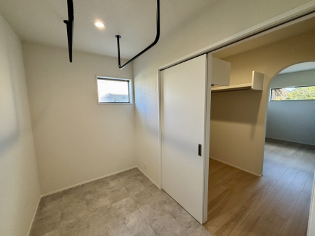 アイアンバーがカッコイイ3帖のランドリールーム ファミクロ、寝室へと繋がっています