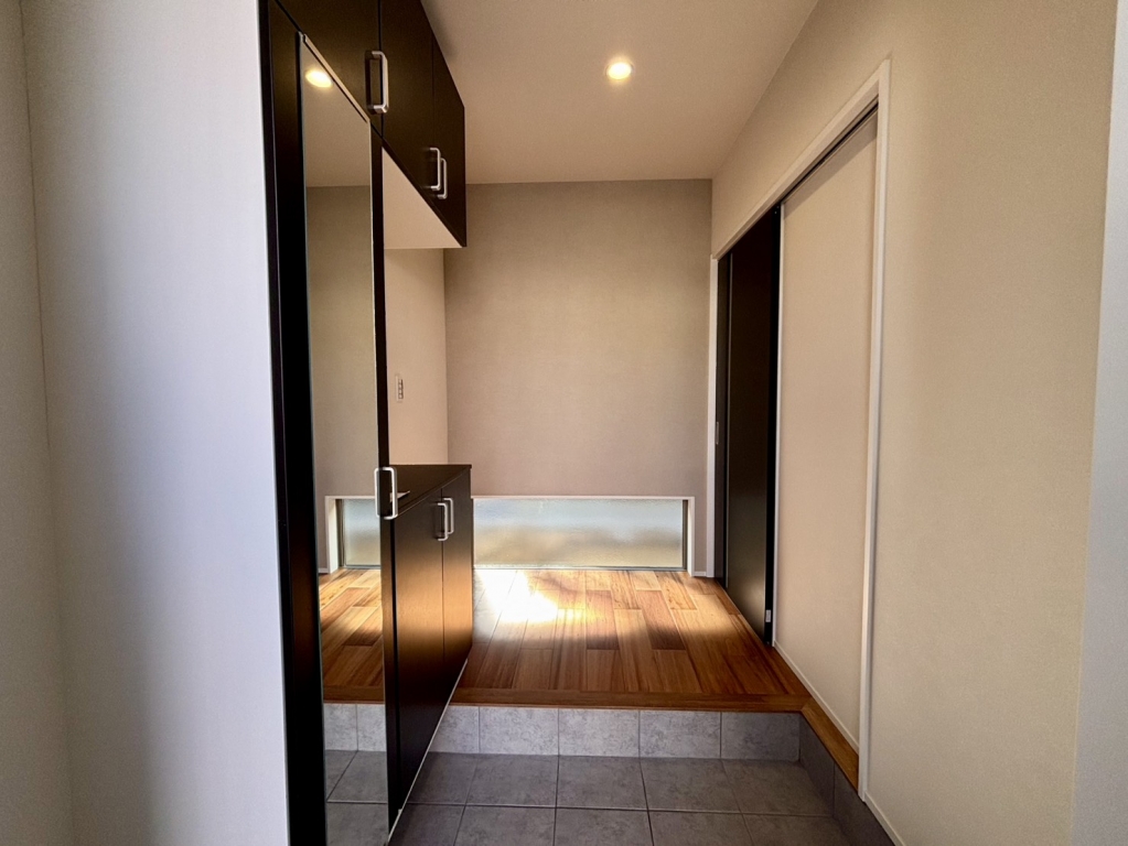 ホールの地窓から光が差し込む玄関 大容量のシューズボックスには鏡付き