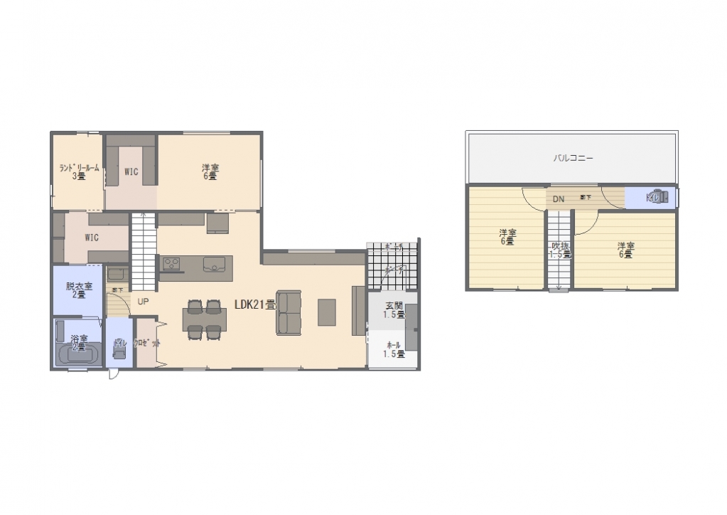 寝室を1階に設けた半平屋タイプ。寝室→WIC→ランドリールーム→ファミリークローゼット→脱衣室→洗面室→キッチンとすべてが繋がる回遊導線は導線抜群で家事の負担も軽減。