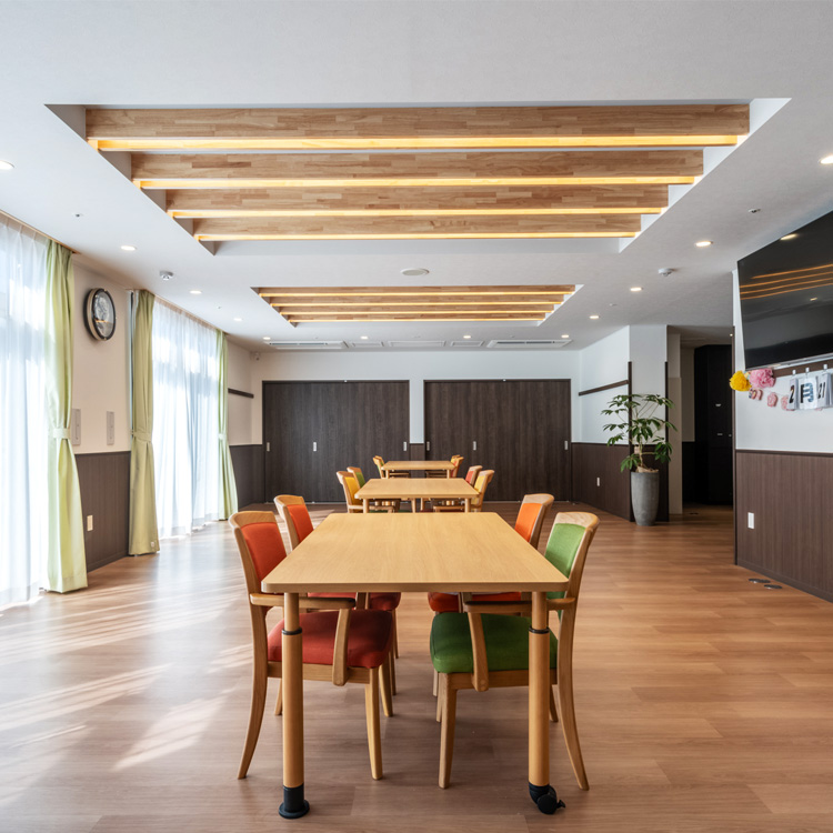 この新しい施設では、「スタッフが働きやすく、入居者様が快適に過ごせる空間」を目指しました。入居者様にとっては、ここが日々の暮らしの場になります。だからこそ、日当たりの良い食堂や、開放感ある高い天井など、心地よさにこだわった設計を採用しています。特に食堂の窓から見える緑の景色は、自然を感じられる癒しの空間として、多くの方にご好評いただいています。