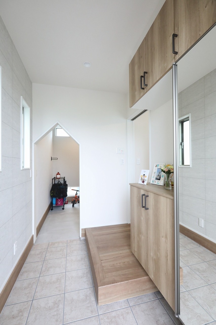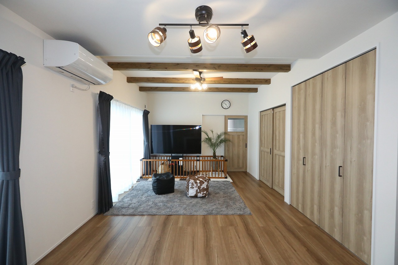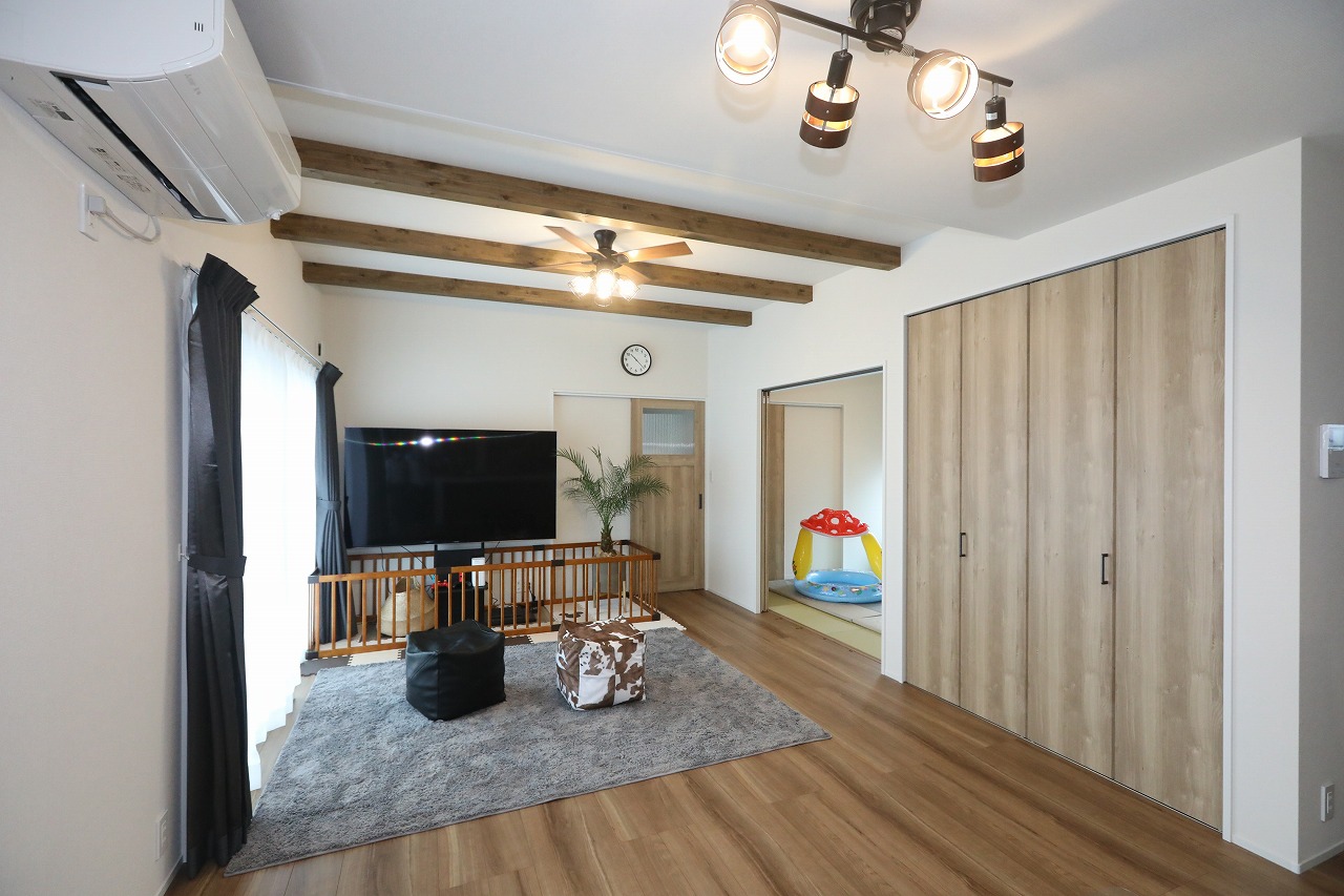 一番好きな場所は大きなリビングです。当初リビングは吹き抜けがいいと漠然と思っていましたが、SANWAさんの物件は天井が高いので、吹き抜けでなくても開放感を感じます。ここならやんちゃな我が子も走り回って自由に遊べますね。広くても、冬はあたたかく快適に過ごせています。それから土間です。ペットの犬がいるので世話がしやすく、頻回に使うベビーカーや子どものおもちゃの収納に便利。また土間からリビング横の洋和室に繋がる出入口もあるので行き来がしやすいです。