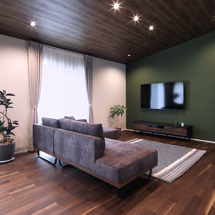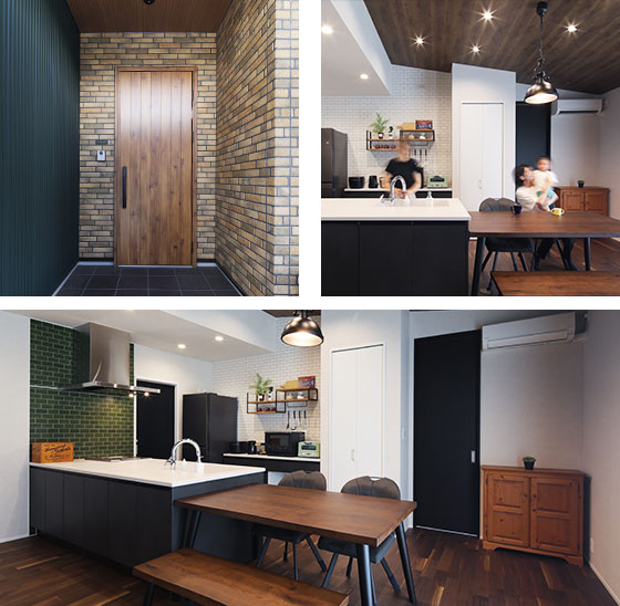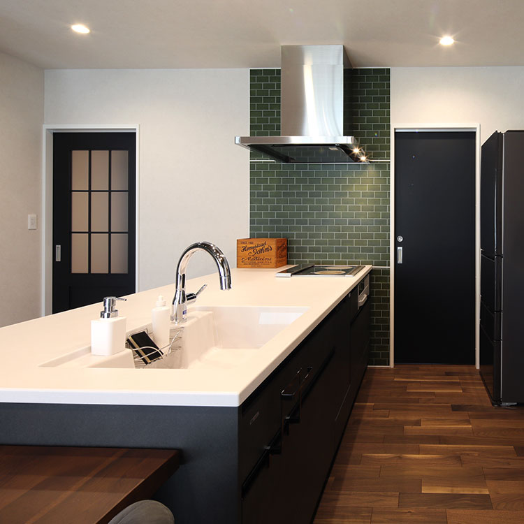 外観は、モスグリーンのガルバリウムとダークブラウンのレンガ調サイディングを組み合わせ、重厚感のあるヴィンテージな雰囲気に。内装にはダークブラウンの無垢材の床を使い、全体的に落ち着いた空間に仕上げてもらいました。水まわりは柔らかいイメージにしたかったのでグレージュ系のカラーでまとめました。アクセントとしてタイル柄のクロスを取り入れ、ちょっとした遊び心もプラス。