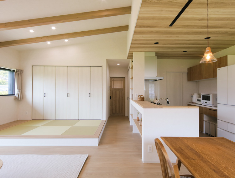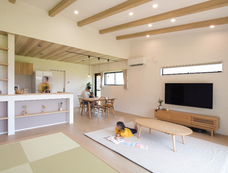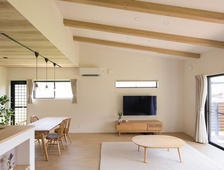 リビングは思い切って広めの間取りにしました。勾配天井は、圧迫感がないため横になった時にいっそう広く感じます。南に面したリビングの窓は大きめにして自然光を入れるようにしました。遠くの山々の景色が目に入り、開放的で心地よく過ごせる空間になっています。