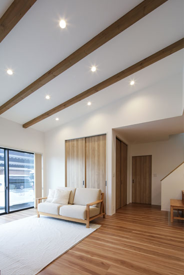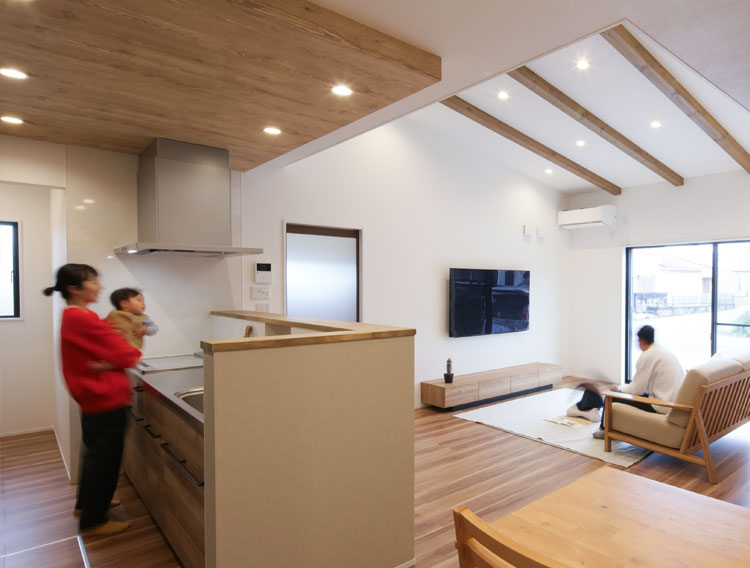 家事動線、広い空間、散らからない、この3点を重視してリビングを中心にした間取り、無駄なスペースをなくす引き戸、収納を多く作ることにこだわりました。リビングは家族全員で一番長く一緒に過ごす場所なので、広くとるようにしました。勾配天井は高さがあり開放的です。リビング隣には子どもを寝かせられる和室を設け、必要に応じて引き戸で仕切って使えるようにしました。