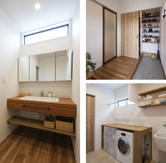 間取りは、1階のクローゼットをリビングとランドリールームの両方から行き来できるように配置したことは、大正解でした。帰宅後すぐにクローゼットに服をかけ、洗うものがあれば、隣のランドリールームに。ランドリールームは洗面所とキッチンにもつながっているため家事がはかどります。