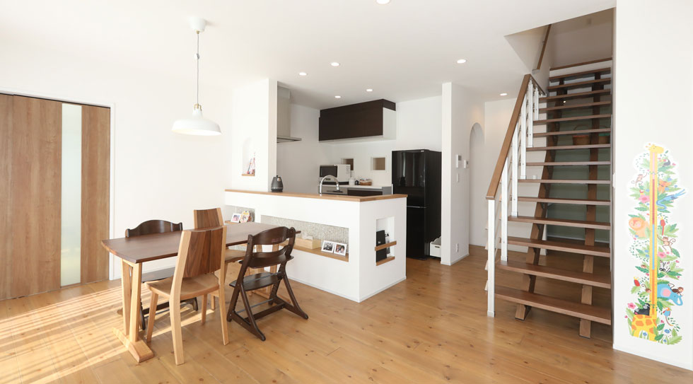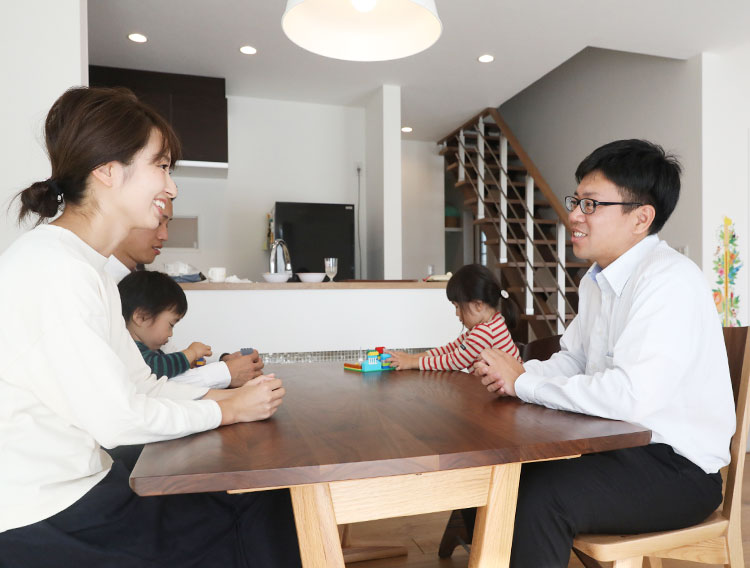 かねてから子育ては地元でと考えていたため、上の子の入園を機に具体的に家を建てるため動き始めました。当初は他社さんで建設の話を進めていましたが、急かされるというか……そんな空気感がなじめず違和感があり……。そんな折、友人を介してSANWAさんを知りお話を伺うと、とにかく焦らされることもなく親しみやすい雰囲気の中、私たちのペースでいろいろ決めることができ、これなら「希望の家を建てられそうだ!」とSANWAさんに決めました。建売物件も多数手がけるSANWAさんなので、実際に建っている家をたくさん見学させていただき、それぞれの私たちが気に入った所を参考に、わが家にも取り入れられたのも、とても良かったです。