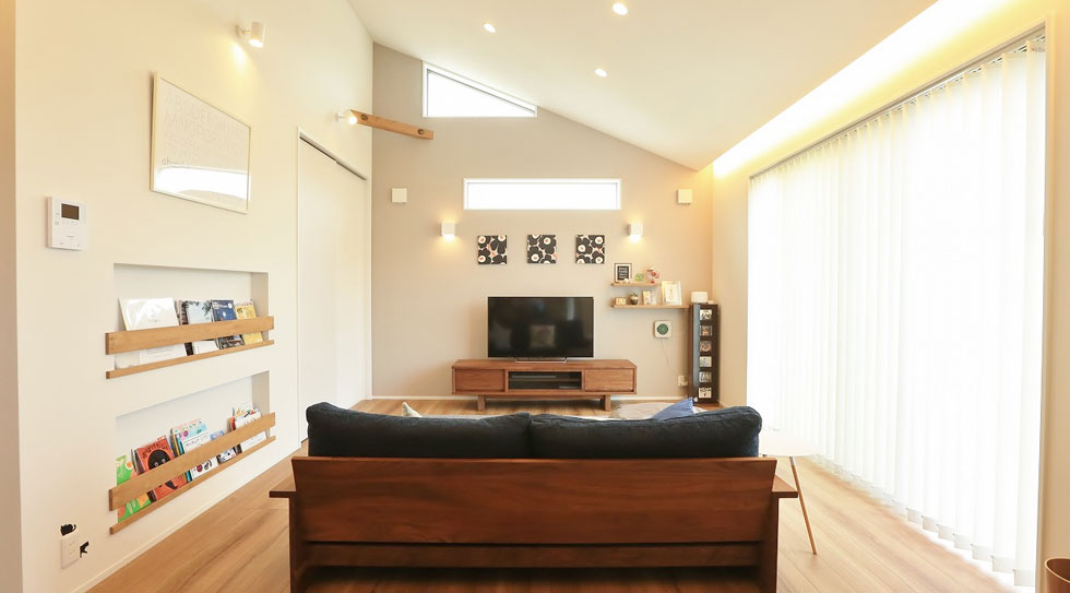家の中で気に入っているのが広いリビングです。「家族全員がずっと快適に過ごせる場所」にしたかったので、開放的にするために天井を高くしてもらいました。天井が高くなることで部屋全体がより明るくなるよう、窓も追加していただけたこともあり、毎日気持ちよく過ごすことができています。また、リビングはいつもスッキリとさせておきたかったので、壁に絵本などを入れるマガジンラックやウォールシェルフなども作ってもらいました。他にも収納スペースをたくさん作ってもらったり、外構もメンテナンス重視で選定していったことは本当に良かったです。いろいろとお願い事が多かったのですが、現場の方々も快く引き受けてくださり、本当に感謝しています。