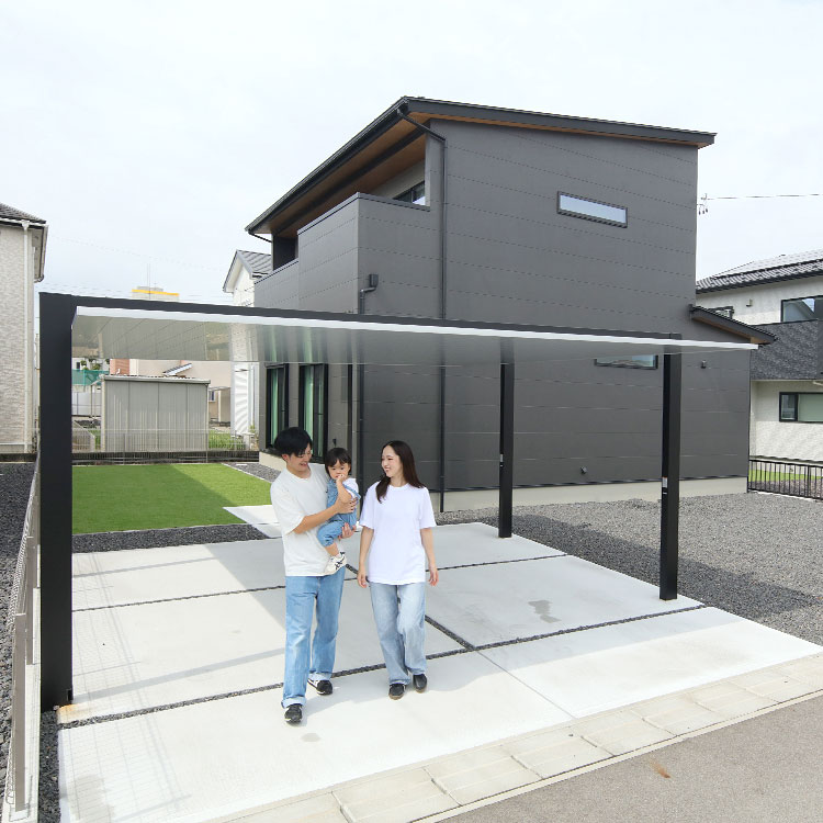玄関ポーチが広いので雨の日でも濡れずに出入りできたり、庭でBBQやプール遊びができたり。駐車場まで屋根があるのでサッと出かけられるのも便利です。