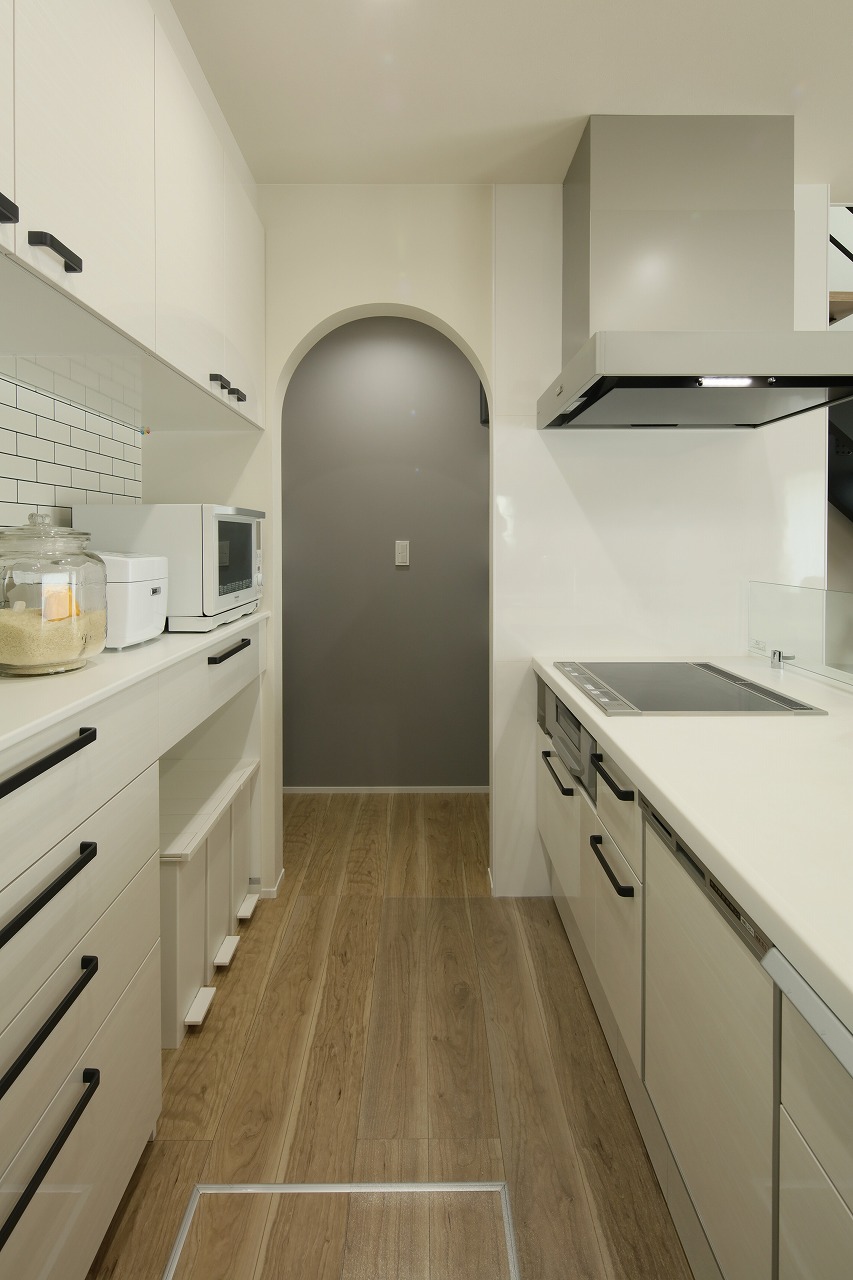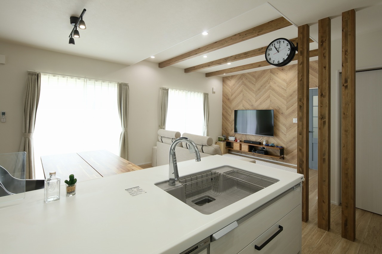 以前住んでいたところは壁付けのキッチンだったため、家族に背をむけて家事をしていました。新しい家は、対面キッチンで家事をしながらでも家族の様子が見えるので、以前よりもコミュニケーションがとりやすくなりました。さらに、キッチンの裏側に洗面室とお風呂がある間取りのため、同時進行になりがちな家事もスムーズになりとても助かっています。