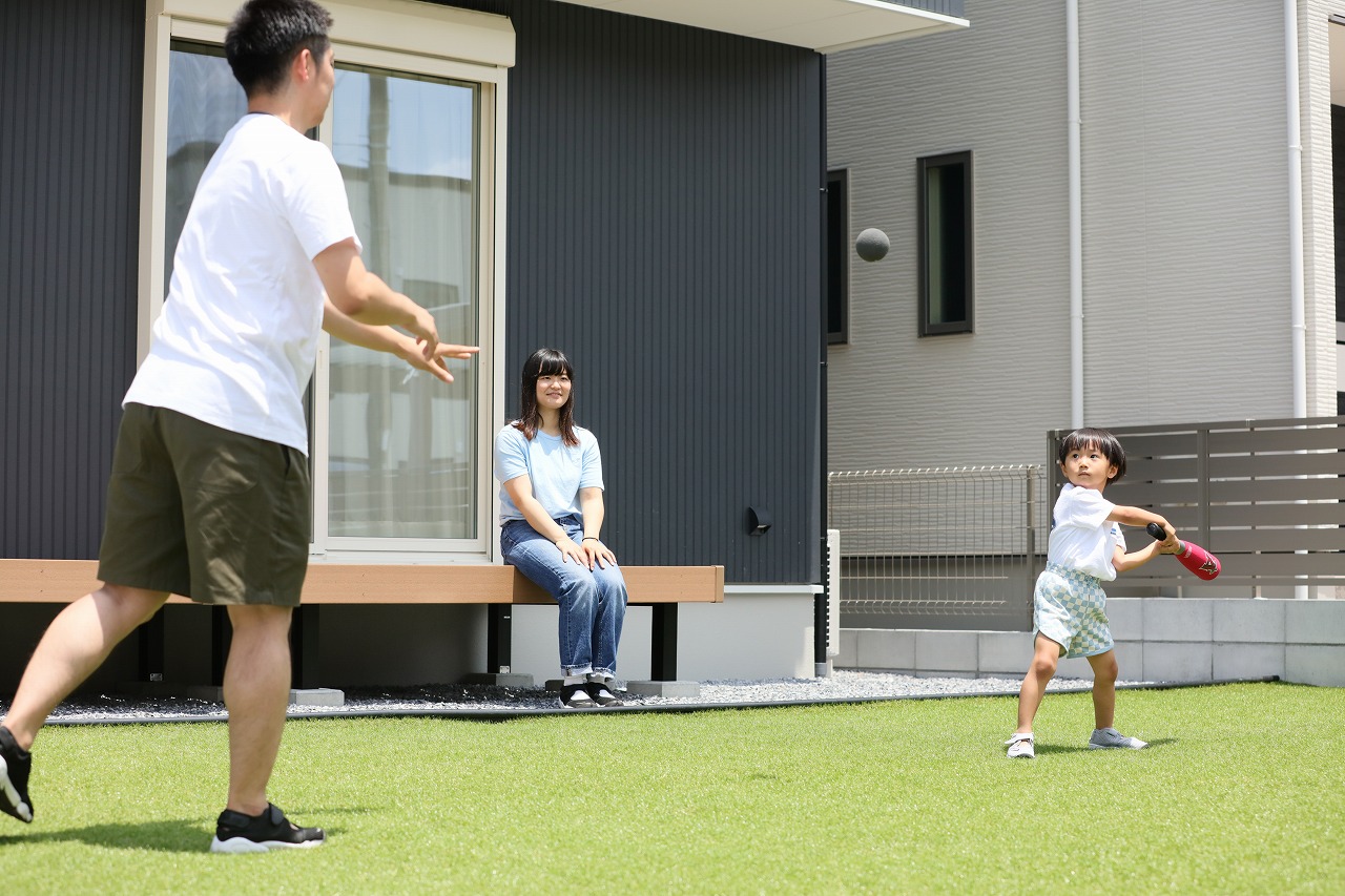 家と駐車場のスペースを除いても、子どもとキャッチボールができるくらい十分な広さの庭があります。子どもも思いっきり駆け回ることができ、楽しそうに過ごしています。そんな子どもの姿が見られるウッドデッキは休日の特等席。愛車も眺めることができ、最高に寛げる場所になりました。
