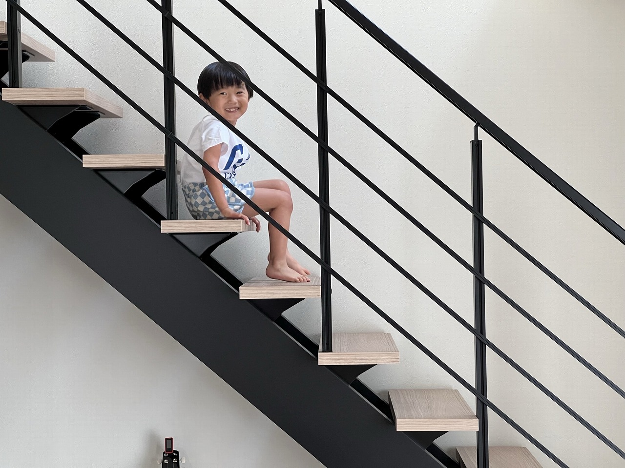 家の中で一番のお気入りは、リビングの扉を開けて真っ先に見える階段です。分譲住宅では珍しい黒のスケルトン階段は存在感があり、LDKのポイントになっています。この階段に合わせて照明もマリンランプにしたり、好きなアクセントクロスを使うことで一味違ったオシャレな内装になりました。