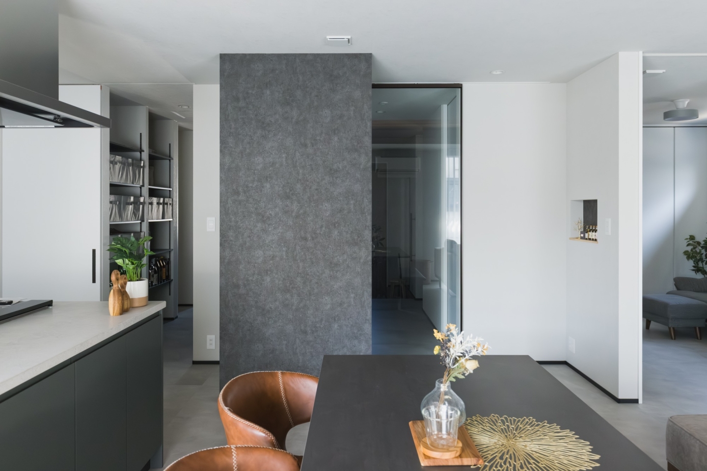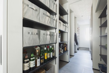パントリーを中心に回遊できる動線にすることで、家事のしやすさはもちろん、自然と片付く仕組みをつくっています。