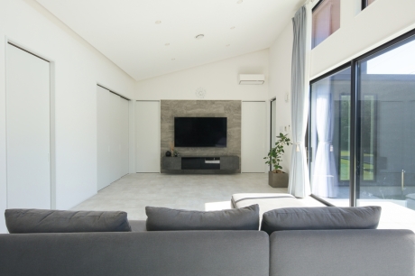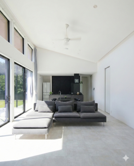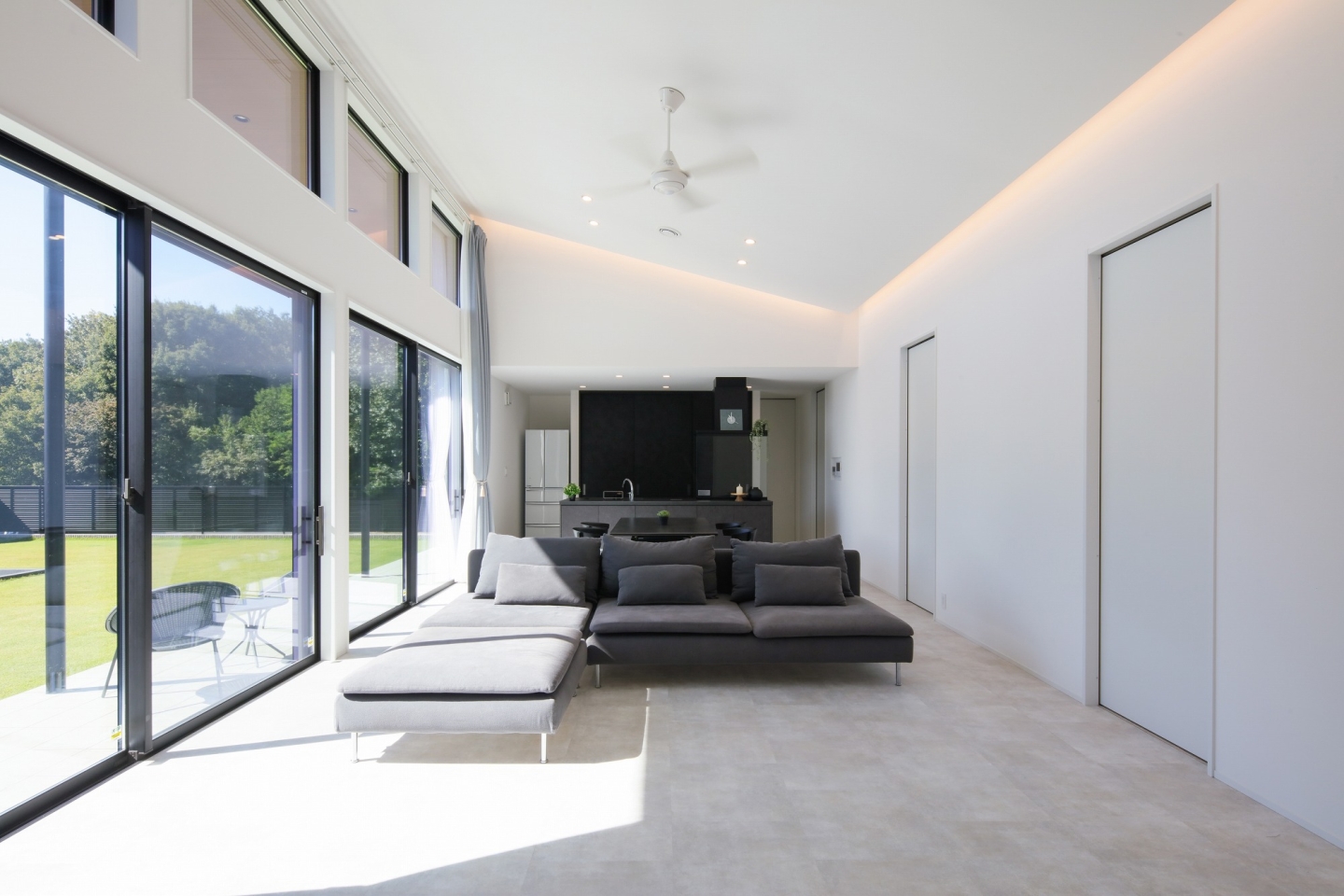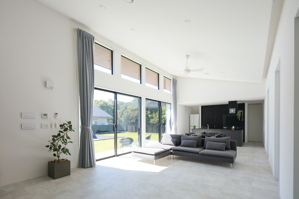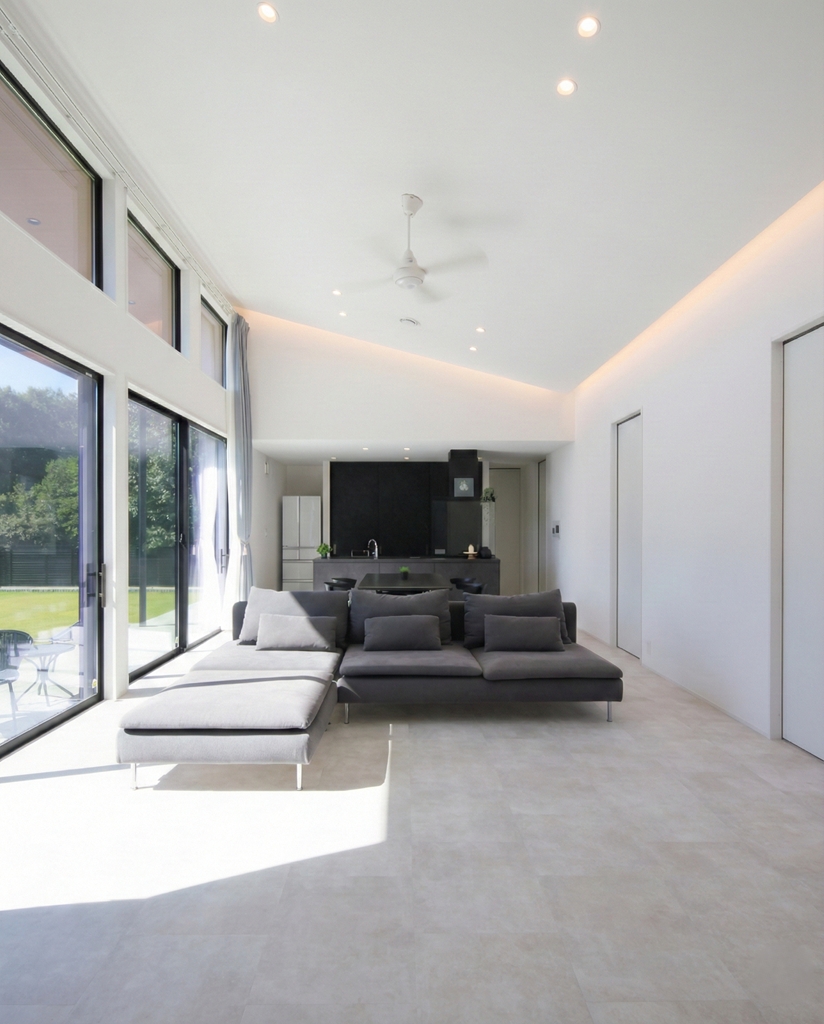 白を基調とした内装が印象的な、約30畳の広々としたリビング。