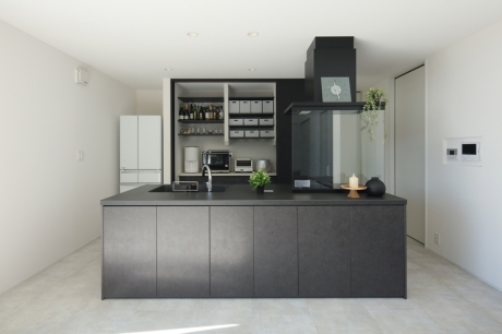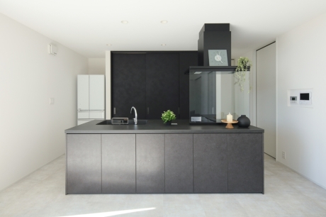 中心には存在感のあるブラックキッチンを配置し、空間全体を引き締めるアクセントに。