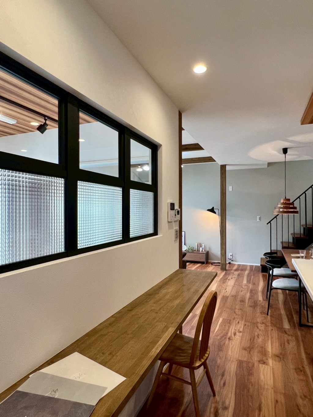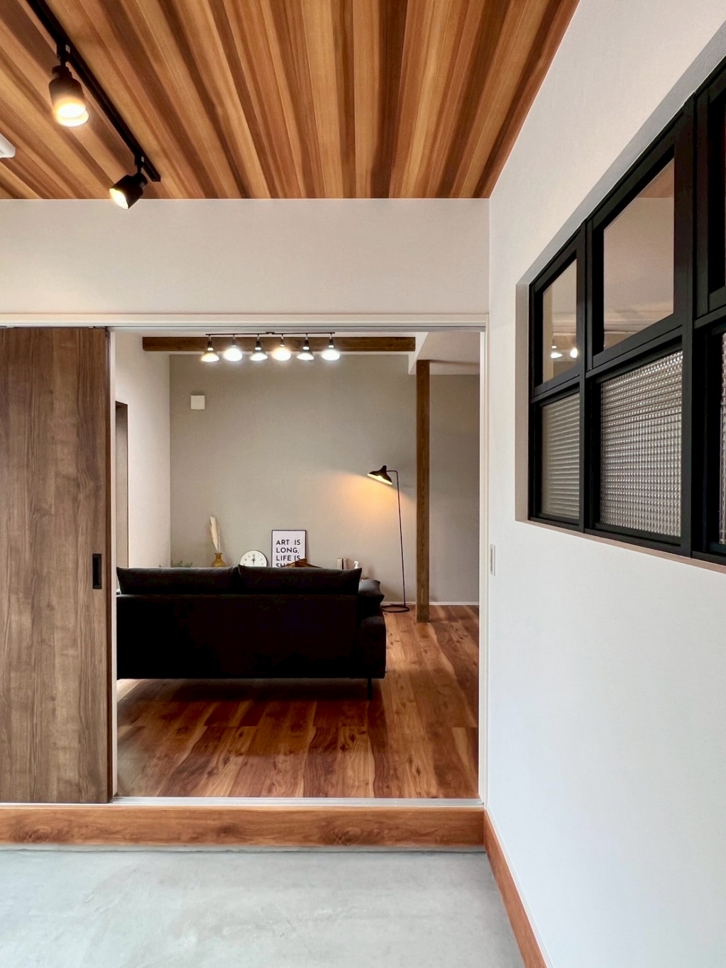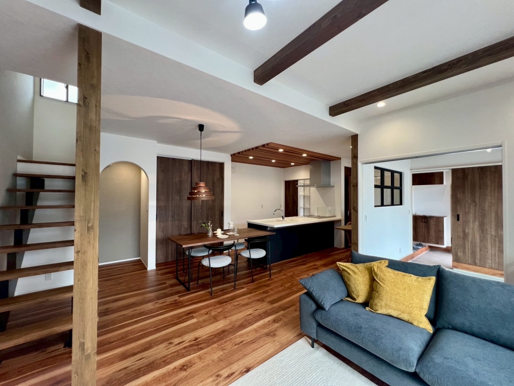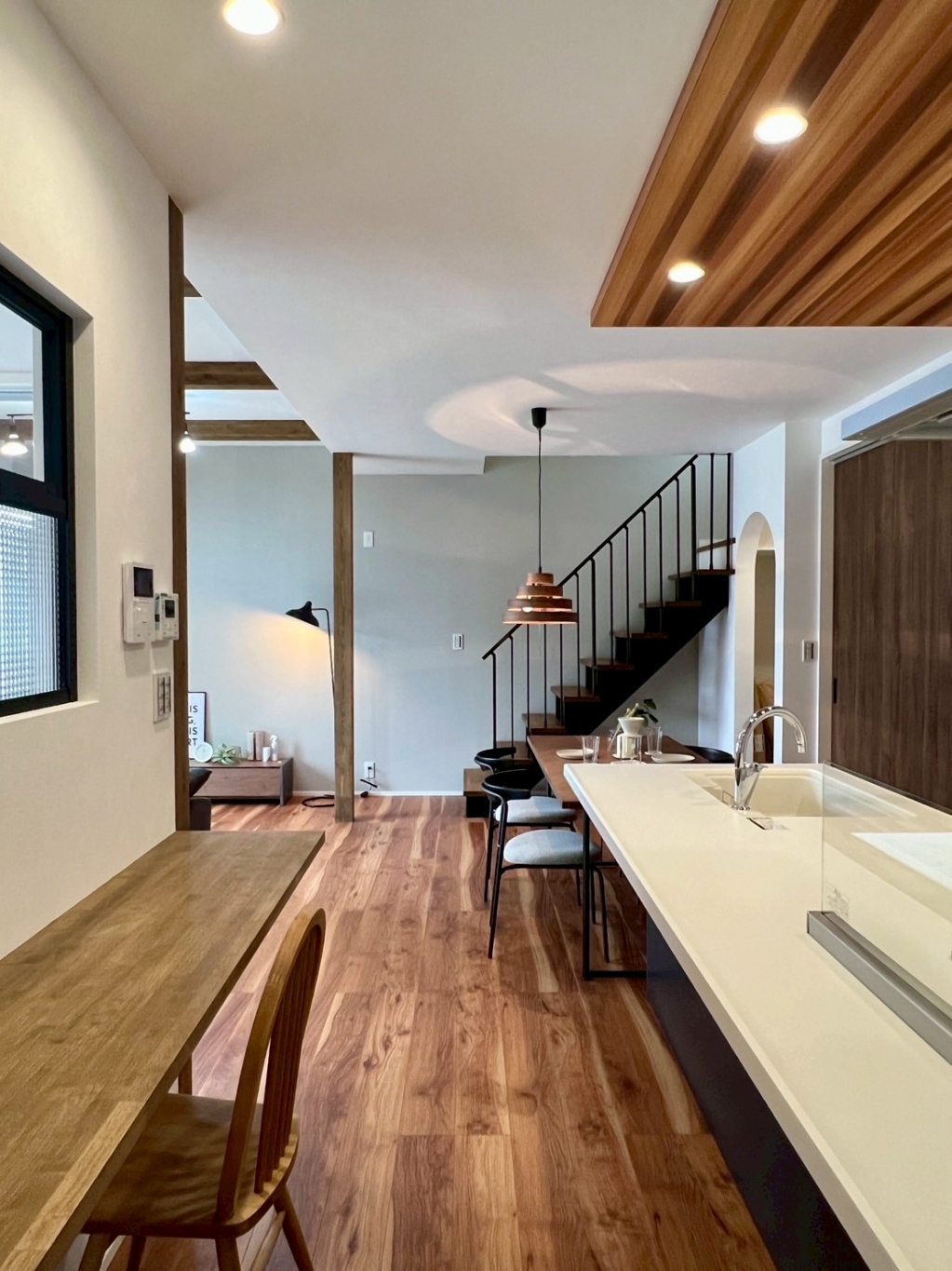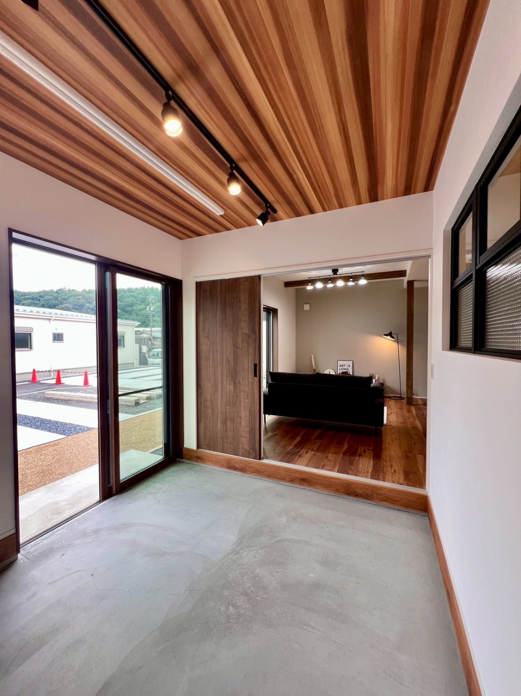 玄関とLDKをつなぐ土間仕上げのアウトドアリビングは掃き出し窓を設け開け放てば室内にしてアウトドア空間に。間口の広い敷地に設けたお庭で遊ぶお子様やペットを眺め室内キャンプやDIYに趣味部屋やくつろぎのくつろぎの空間など様々な用途に。スリット階段や化粧柱やフラットキッチンで開放感あふれるアウトドアハウス!