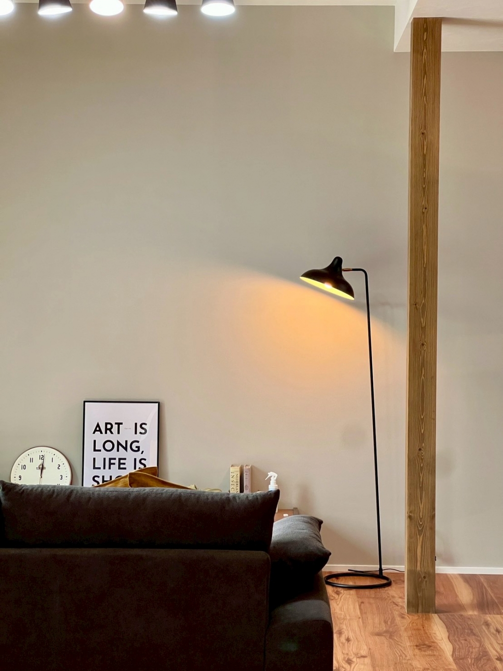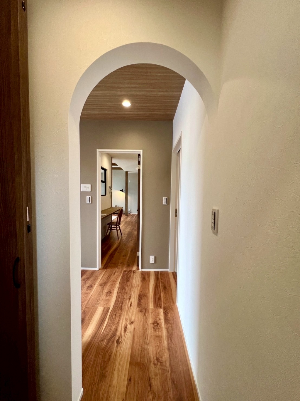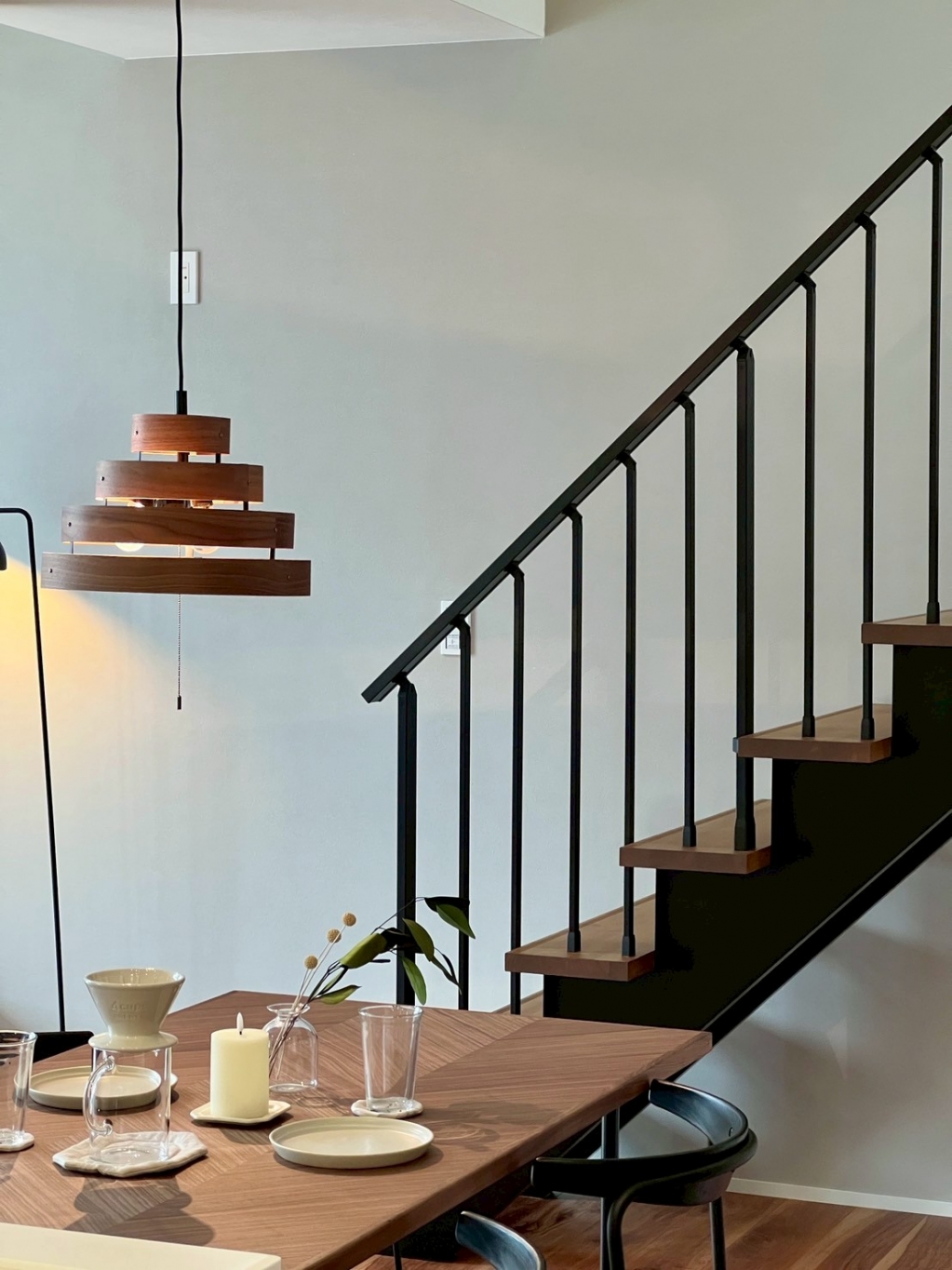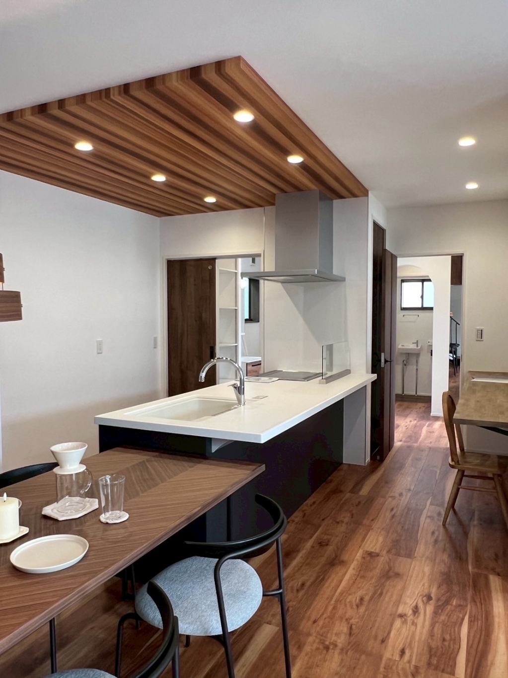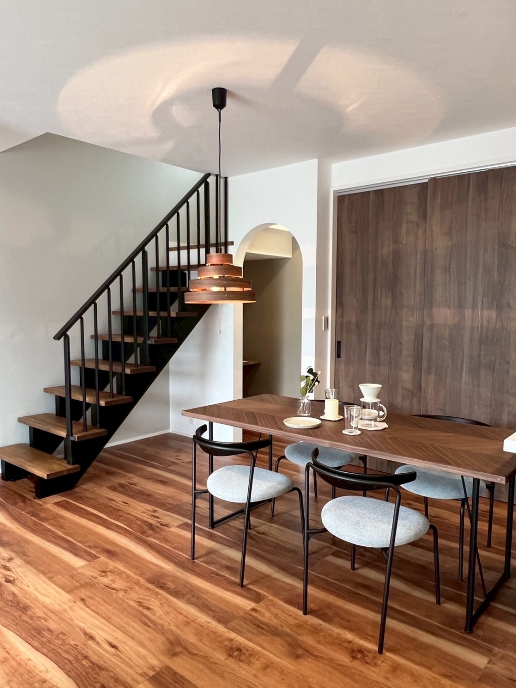 玄関とLDKをつなぐ土間仕上げのアウトドアリビングは掃き出し窓を設け開け放てば室内にしてアウトドア空間に。間口の広い敷地に設けたお庭で遊ぶお子様やペットを眺め室内キャンプやDIYに趣味部屋やくつろぎのくつろぎの空間など様々な用途に。スリット階段や化粧柱やフラットキッチンで開放感あふれるアウトドアハウス!