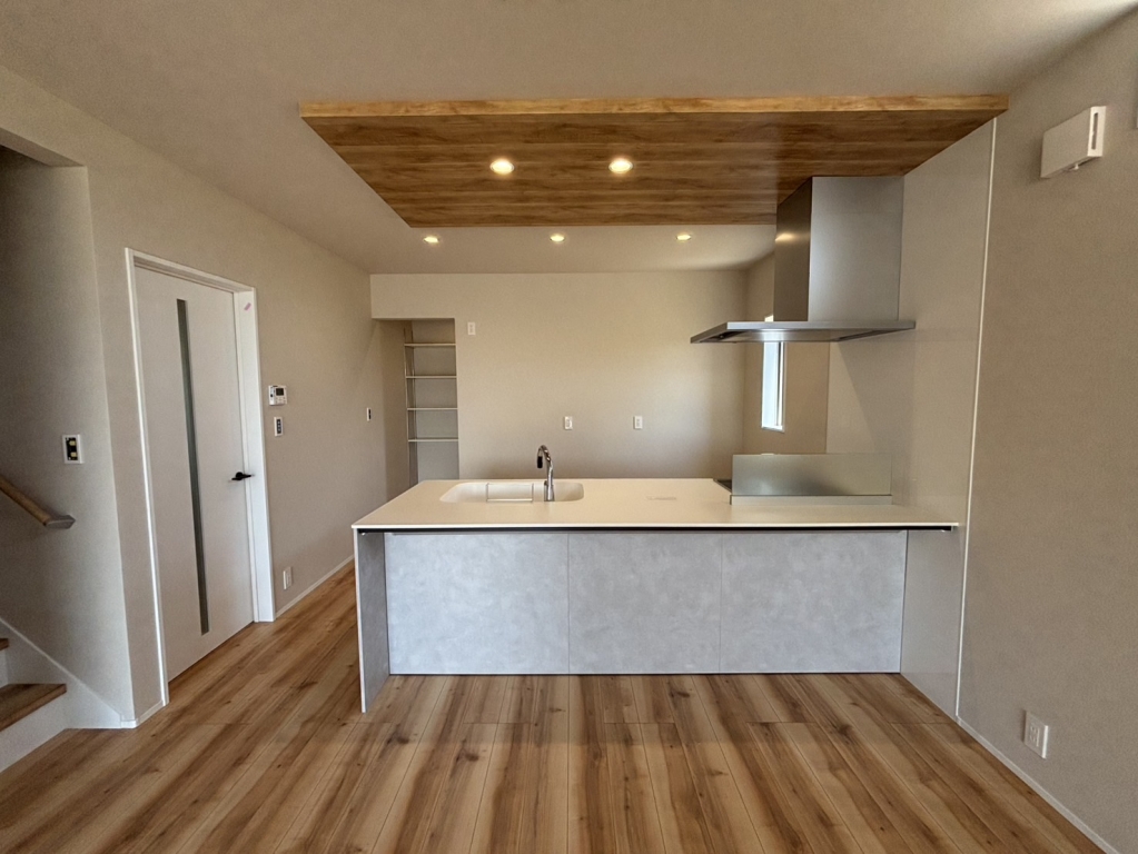 玄関に入るとオシャレな収納棚☆22帖のLDKには東壁についた天井付のデザイン窓から明るさを確保!隣接した洋和室や大容量のパントリーも必見♪外観も内観も木目とホワイトを基調とした流行に流されない王道スタイル!